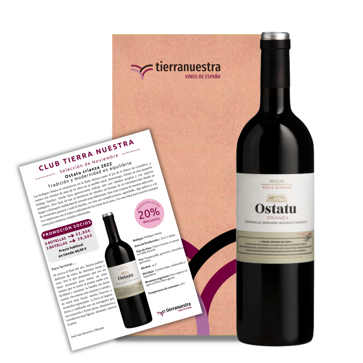 Las bodegas Ostatu se encuentran en la Rioja Alavesa justo al pie de la Sierra de Cantabria, y cuenta con viñedos de más de 50 años en su pueblo natal, Samaniego. Ostatu es una pequeña bodega familiar. Desde hace generaciones trabaja sólo con viñedos propios y con espíritu ecologista. Esto hace de sus 36 hectáreas de viñedos un bosque de 50 microparcelas donde se llegan a distinguir cualidades de terruño muy diferentes. Este vino crianza de nuestra selección